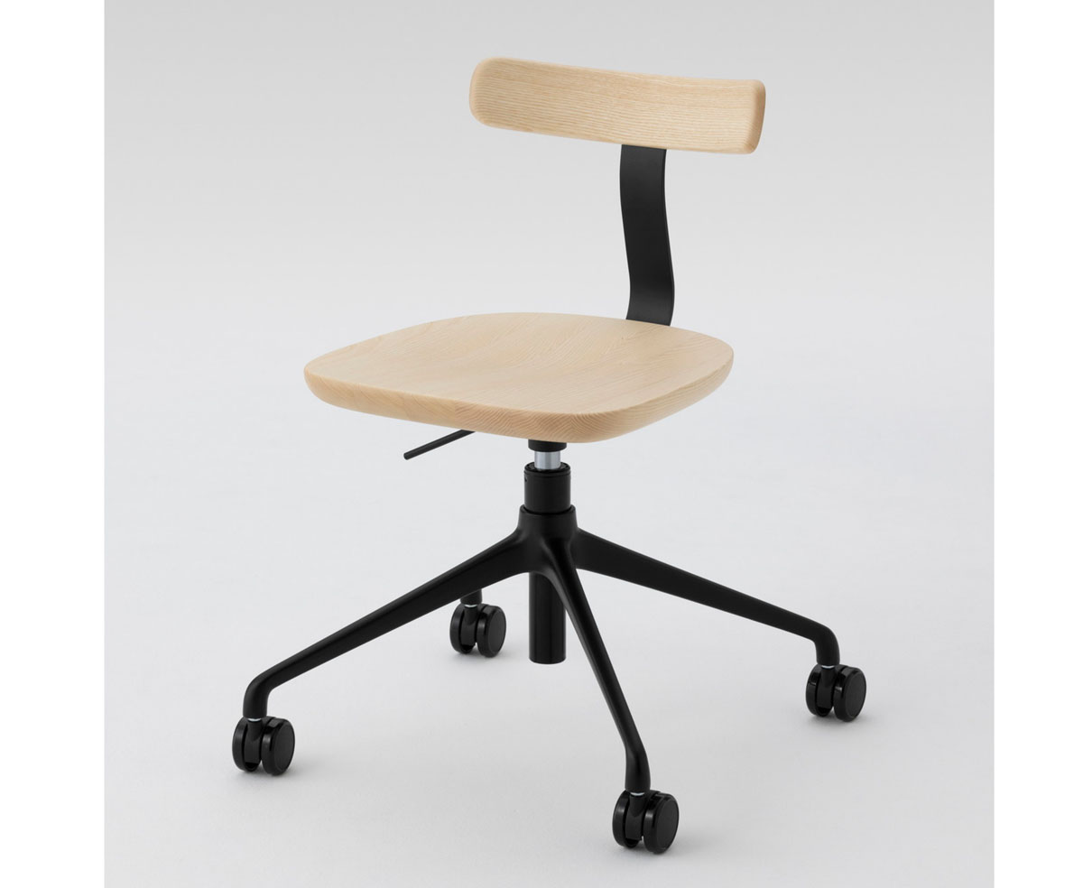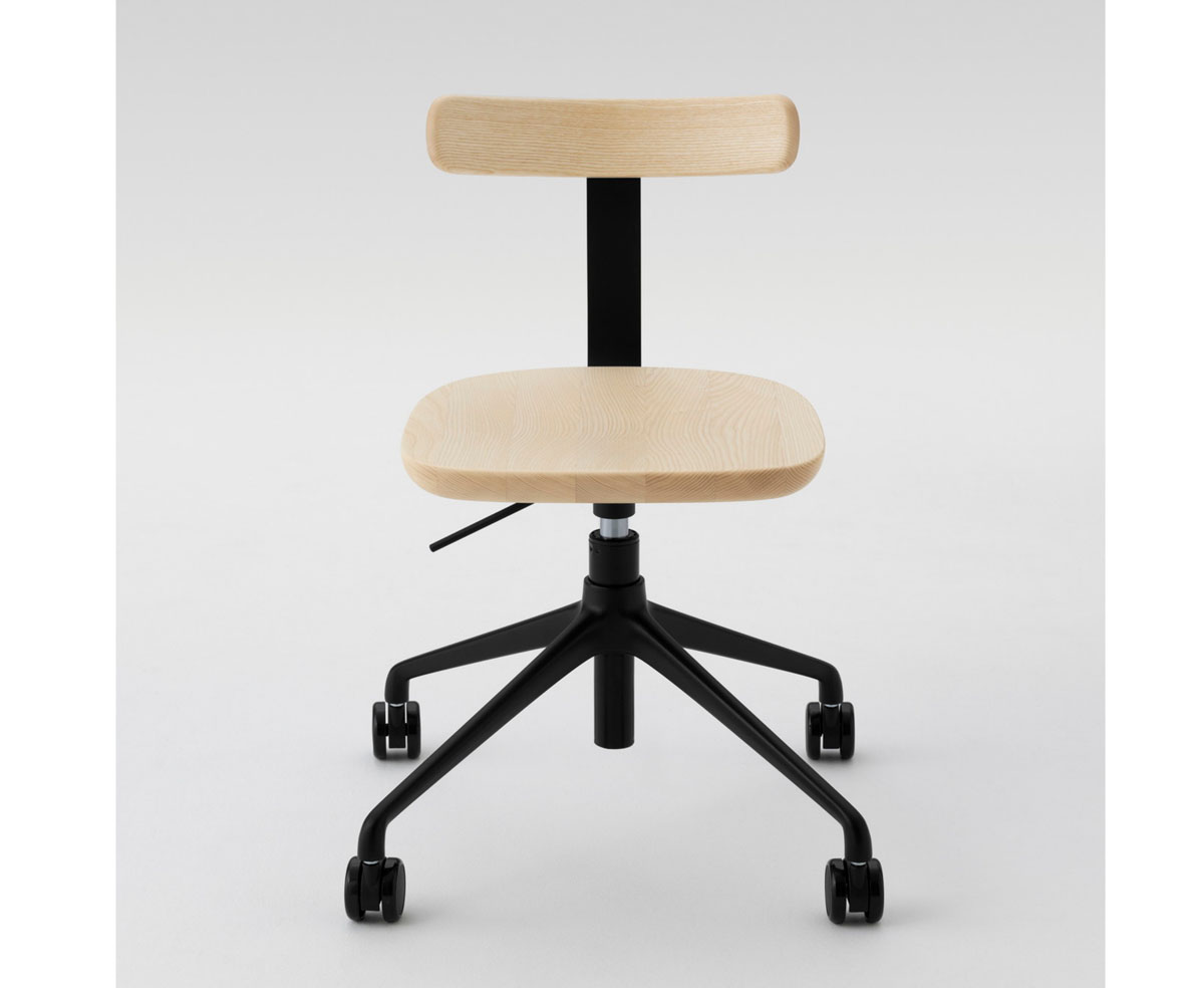 T Chair is made of 3d machined solid maple wood with seat and back joined with a formed, painted strip of sprung steel which improves comfort. The coloured metal S shape provides a contrast with the wood and an element of freshness to a familiar typology. O Stool is similarly of 3d machined solid wood and the stool mid and high have painted steel tube footrests. The handle, consisting of an elongated hole machined through the centre of the seat is shaped for maximum comfort when carrying the stool. It is also a familiar typology revitalised with improved comfort and new materials.